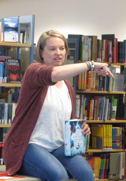 Sie verrät außerdem, dass ihr persönliches Lieblingswerk immer das Buch ist, an dem sie gerade arbeitet, da es sie in jeder Minute des Tages beschäftigt. Dass der Prozess von der ersten Idee zu einem Buch bis zur Veröffentlichung manchmal sogar länger als ein Jahr dauert, mit einer Ausnahme: „Schattenflügel“ habe sie in wenigen Monaten verfasst. Mit welchem Buch ihr der Durchbruch als Schriftstellerin gelungen ist (40 Stunden) und was sie als Jugendliche früher einmal werden wollte (Polizistin). Zum Schluss nimmt sie sich noch viel Zeit Bücher und Autogrammkarten persönlich zu signieren. Einige begeisterte Schülerinnen und Schüler konnten in den Folgestunden dabei beobachtet werden, wie sie heimlich in ihren neu erworbenen Büchern schmökerten…