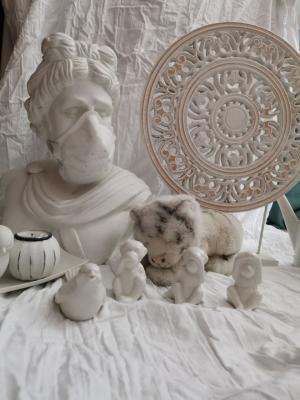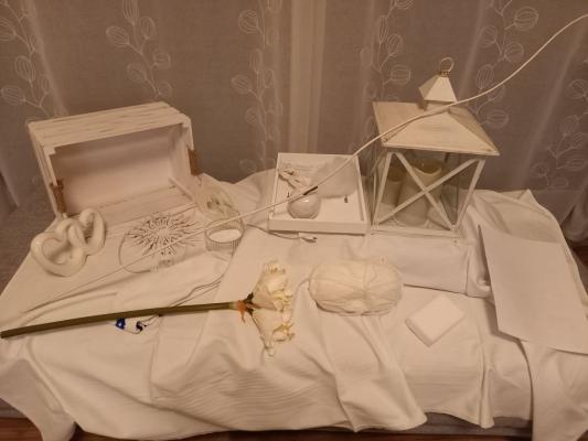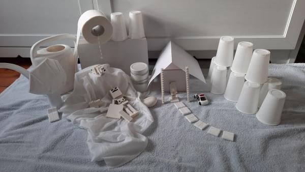 Angesichts der Schneelandschaft vor der Tür (zu Beginn des Jahres) wurden die Schüler aufgefordert, aus rein weißen Gegenständen und Tüchern im Inneren eine Assemblage (vorübergehendes Zusammenfügen dreidimensionaler Objekte zu einem Kunstwerk) zu bauen und diese als Foto einzureichen.