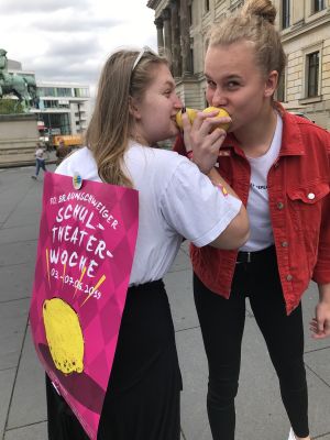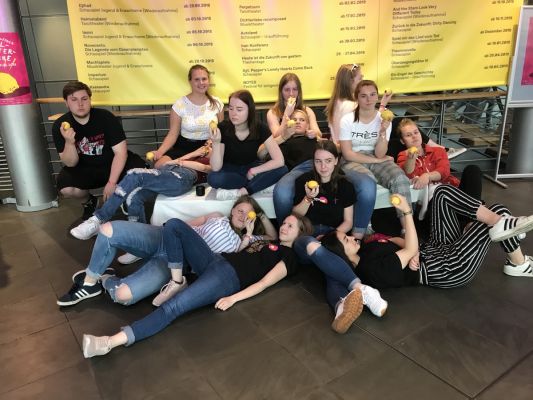 Am 06.06.2019 fuhren 15 Schülerinnen und Schüler aus dem Seminarfach Theater mit Frau Koller anlässlich der 50. Schultheaterwoche nach Braunschweig ins „Kleine Haus“. Dort trafen wir zwei Studierende der HBK (Hochschule für Bildende Künste), um mit ihnen die letzten Vorbereitungen für unsere Präsentation „Zitronensofa“ zu treffen. Ein paar Wochen zuvor hatten wir die Inszenierung in einem Workshop im Unterricht geübt. Dort setzten wir uns auf einige Holzkisten und aßen Zitronen, mit Schale. Dabei filmten wir uns gegenseitig und nahmen unsere Reaktionen und Gesichtszüge während des Essens auf. Teilweise stellten wir auch bestimmte ausdrucksstarke Posen und aßen die Zitronen sehr genüsslich.