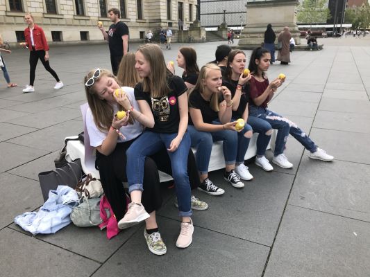 Insgesamt wiederholten wir die Aktion zweimal an verschiedenen Orten, jeweils ca. eineinhalb Stunden, da eine Pause zwischen den einzelnen Bissen doch sehr angenehm war. In der Pause sahen wir uns ein Theaterstück einer anderen Schule an.