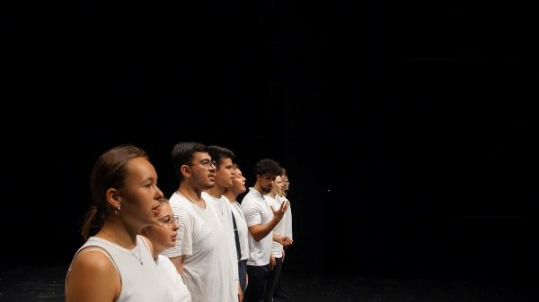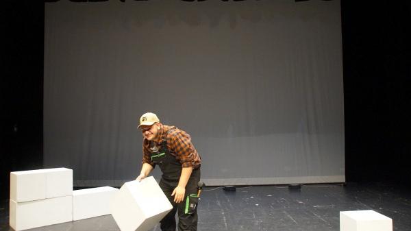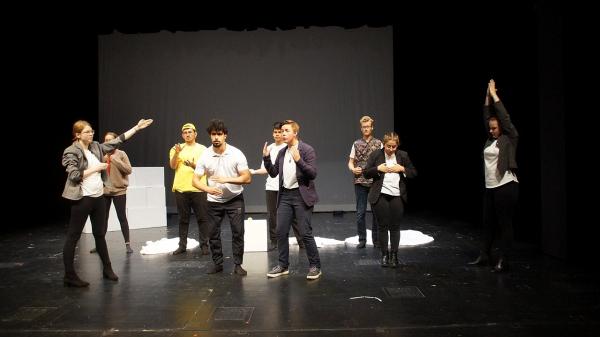 Der Technische Leiter Harry gab uns, mit seinem coolen britischen Akzent, eine kleine Einweisung und schnappte sich anschließend auch schon unsere Techniker*Innen. Sobald die Techniker*Innen beschäftigt waren, entschied sich der Rest von uns das Bühnenbild aufzubauen, um mit den Proben zu beginnen. Trotz der begrenzten Zeit und einigen technischen Problemen mit unserem Interview-Video schafften wir es schließlich, noch einen ganzen Durchgang zu spielen. Doch nun machte sich allmählich die Aufregung bemerkbar. Mit dem Wissen, dass das Kleine Haus fast ausverkauft war und unser ganzer Jahrgang ebenfalls vor Ort war, stieg die Nervosität noch mehr.