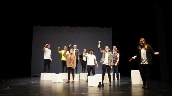 MinisteriumDoch dass wir als Gruppe gleich unsere Arbeit der vergangenen Wochen und Monate präsentieren würden, gab uns noch einmal den letzten Energieschub. Mit Stolz können wir nun behaupten, eine für uns gelungene Vorstellung mit voller Besetzung hingelegt zu haben. Diese tolle Erfahrung, in einem richtigen Theater aufzutreten, kann uns nun niemand mehr nehmen. Und für unsere Fans hatten wir natürlich auch eine Zugabe parat – was für ein Theaterfest!