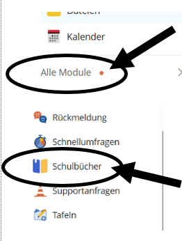 Öffnen Sie den Menüpunkt „Alle Module“ und klicken sie auf „Schulbücher“ Klicken Sie dann oben in der Leiste auf „Anmeldung“.